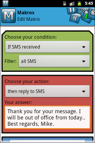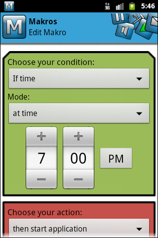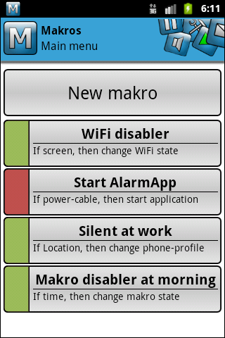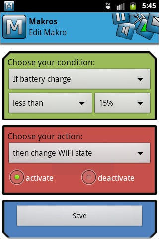 Makros ermöglicht es euch Regeln für euer Handy festzulegen. Ihr wählt eine Bedingung und eine Aktion. Makros läuft im Hintergrung und führt die Regel aus.
