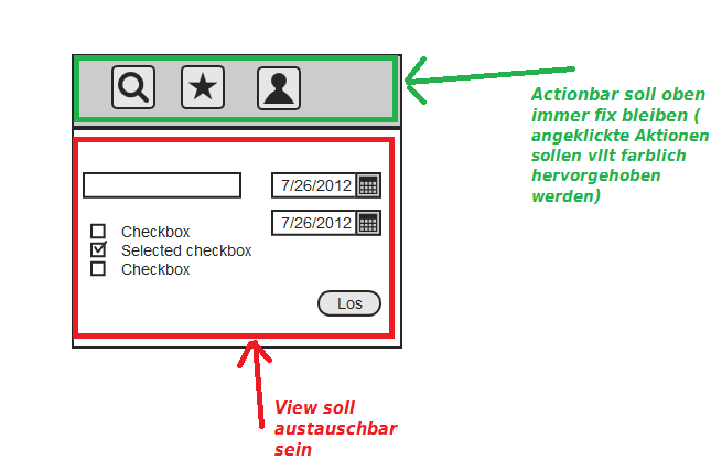 Da ich mich aber mit der Action Bar noch nicht auskenne ( APi 4.03), weiß ich nicht, ob sich das damit realisieren lässt, da ja die mainview, gleichzeitig auch die Action Bar enthält. Wäre es besser auf Tabs umzusteigen? Fände die Lösung mit der ActionBar eleganter.