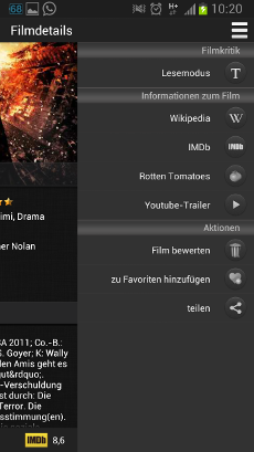 Im IOS Store ist diese App schon sehr erfolgreich (mehr als 10.000 Downloads). Unter Android blieb der grosse Erfolg bislang aus (ca. 400 Downloads), was schade ist, denn diese App hat einige zusätzliche interessante Feature welche die IOS App nicht hat (z.B. Verlinkung auf Trailer, Rotten Tomatoes Rating).