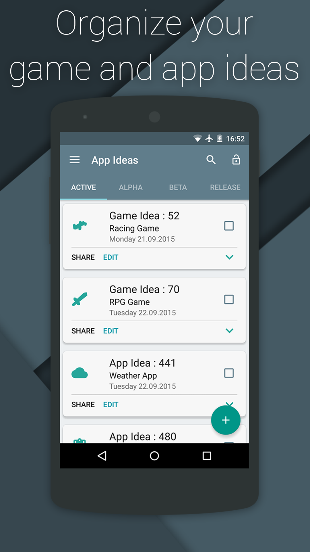 Ihr könnt einfach Ideen hinzufügen und schon laufende Projekte in den Ordnern : Alpha, Beta und Release ordnen.