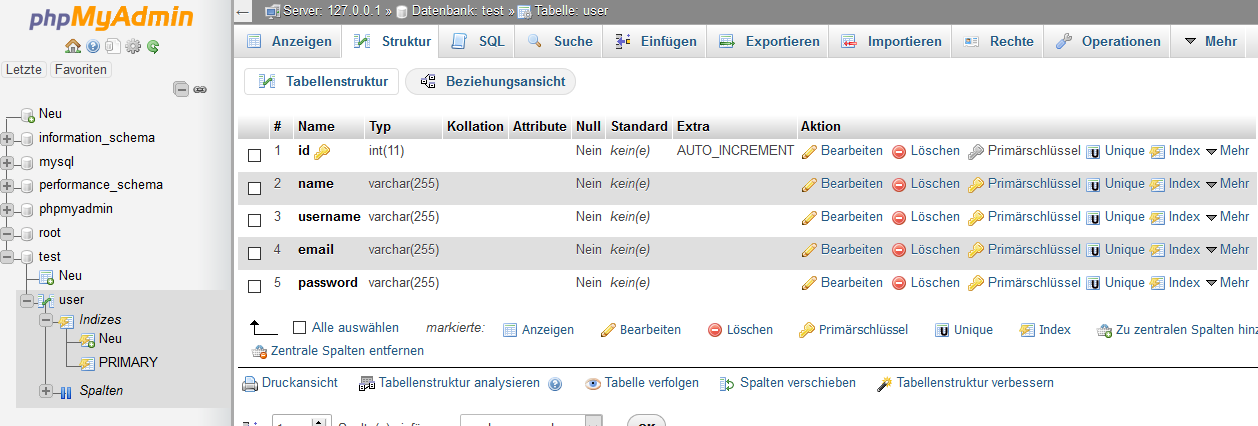 - Der Benutzer wurde bei phpmyadmin angelegt: root%JaALL PRIVILEGESJa