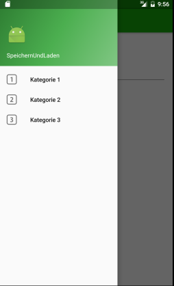 Bei meiner App kann man über einen Navigation drawer verschieden Kategorien aufrufen.
