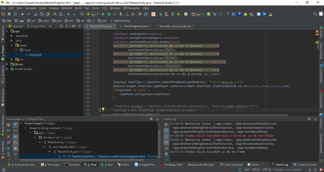 Die genannte R.id. ist die id vom Fragment, in dem sich der zu verändernde Schriftzug befindet (bzw. die Zahlen der Uhrzeit.)