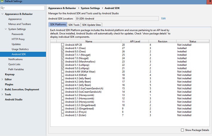 Kannst du im SDK Manager den Haken bei API 28 entfernen und bei 27 setzen.