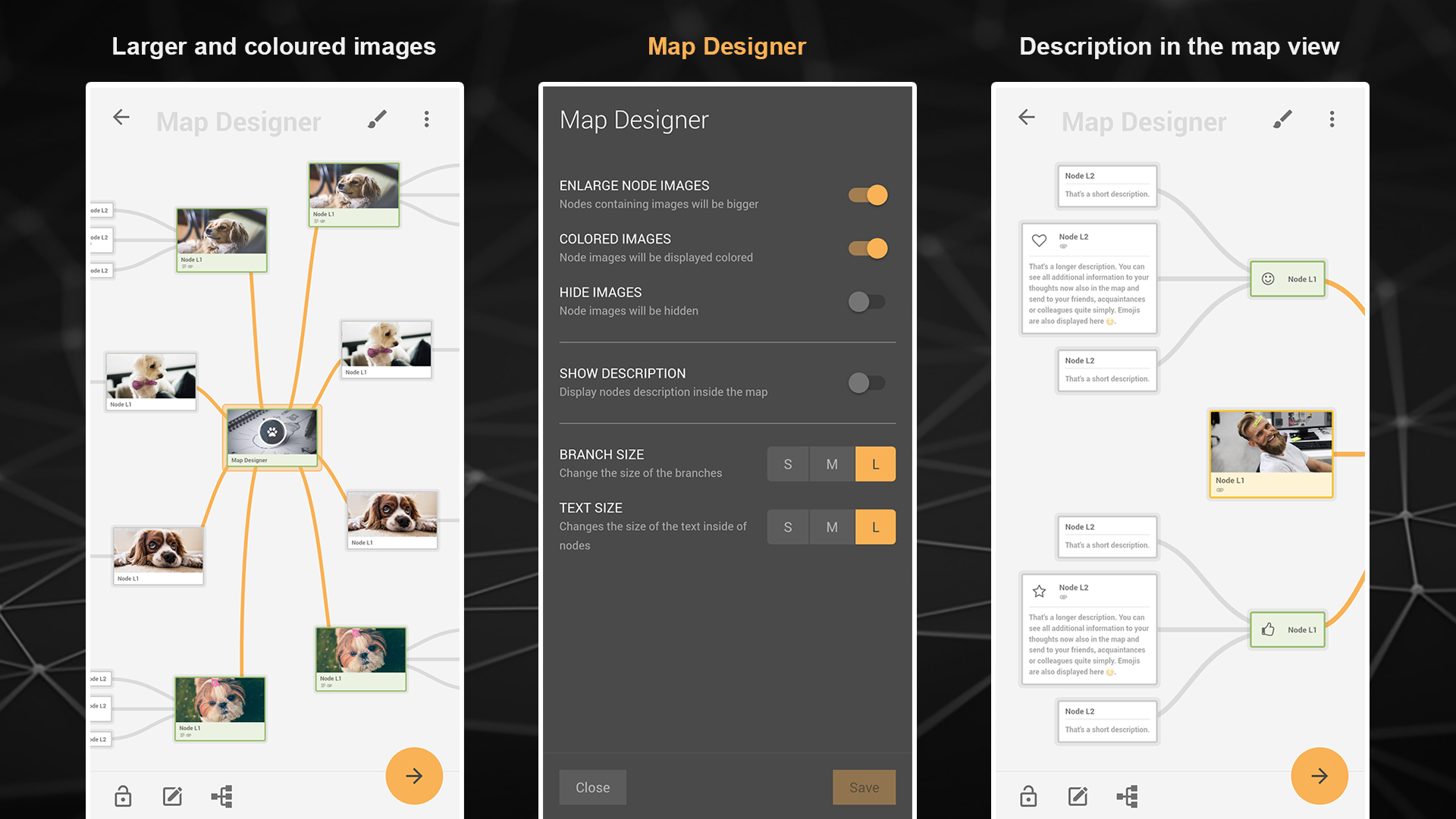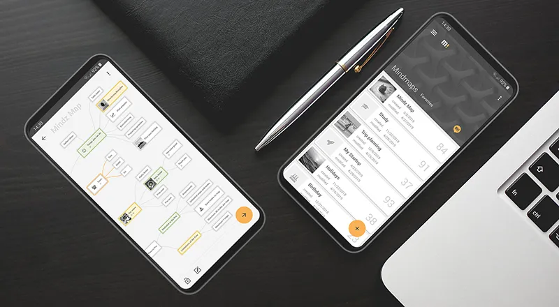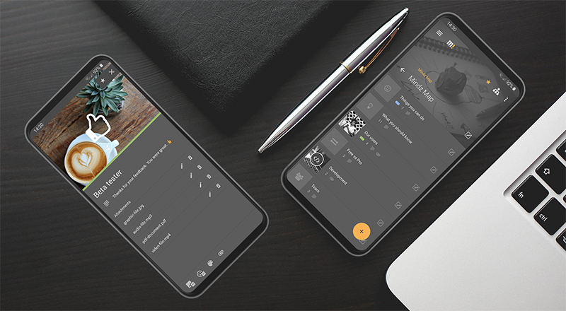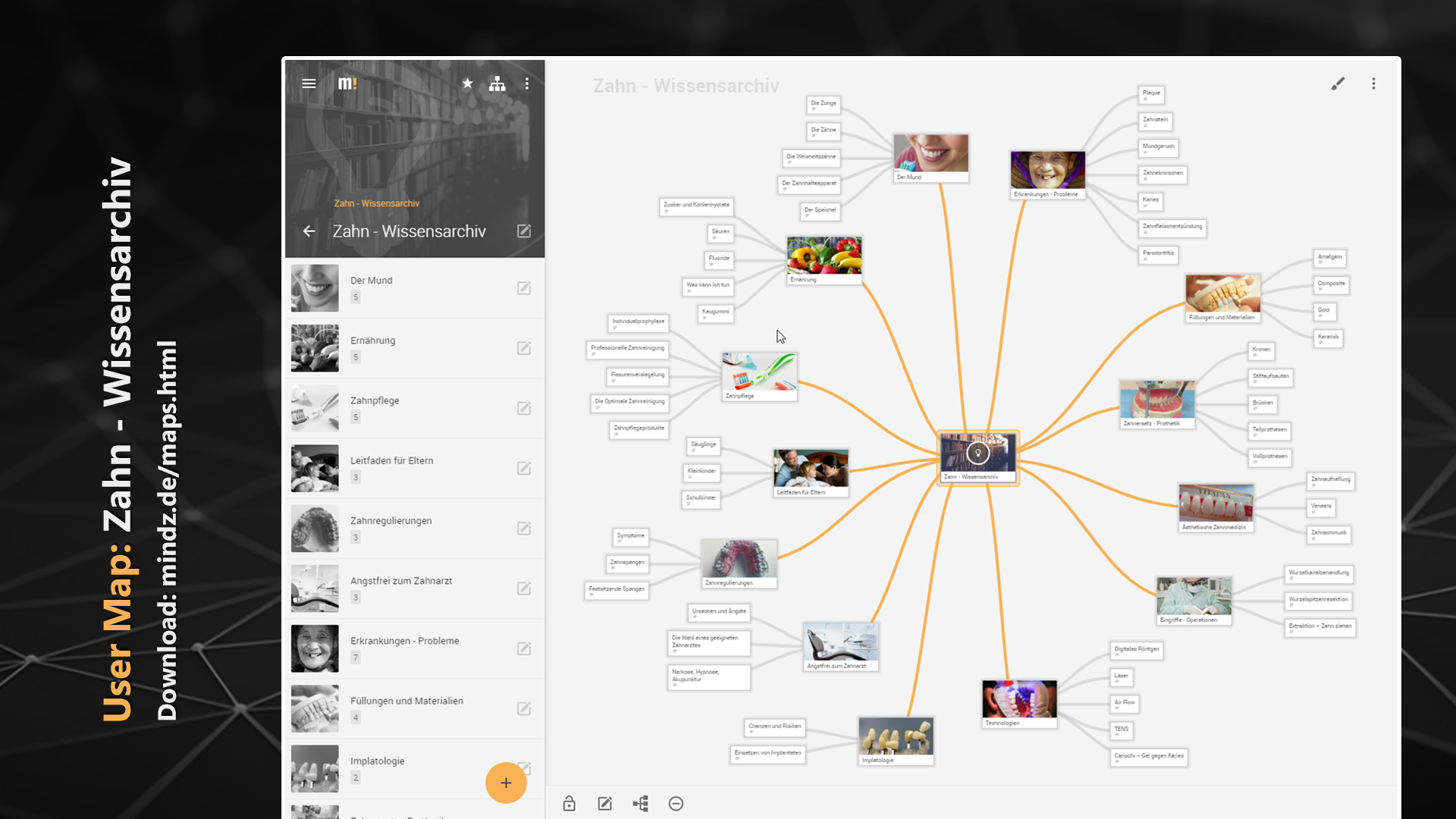 Dark Mode mit links: Detailansicht | Rechts: Listenansicht der Mindmap "Mindz App"