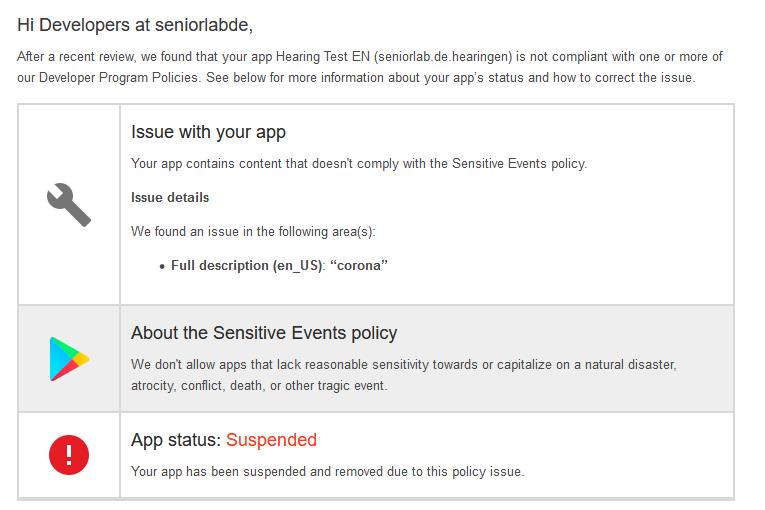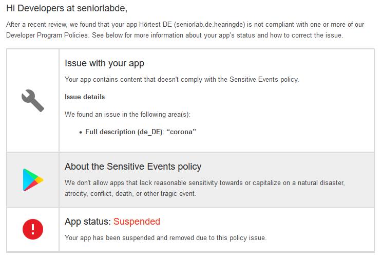 Diesmal war es aber krass. Apps aktualisiert und verbessert bis ANDROID11 und in der neuesten Beschreibung das Wort CORONA verwendet. Die neueste Policy von GOOGLE erlaubt aber diese Wort nicht!