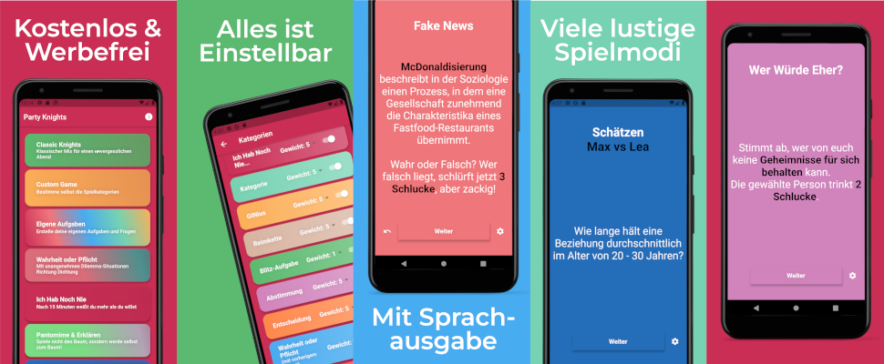 Viele kennen sicher die App Picolo, dort ist aber zum Beispiel ein großer Teil der Inhalte hinter einem wöchtenlichen 4,99€ Abo verborgen. Mein Ziel mit der App ist, eine wirklich umfangreiche, aber trotzdem komplett kostenlose und werbefreie App für Feiern mit Freunden zu erstellen. In den letzten Monaten habe ich lange daran gearbeitet und jetzt ist sie endlich fertig.