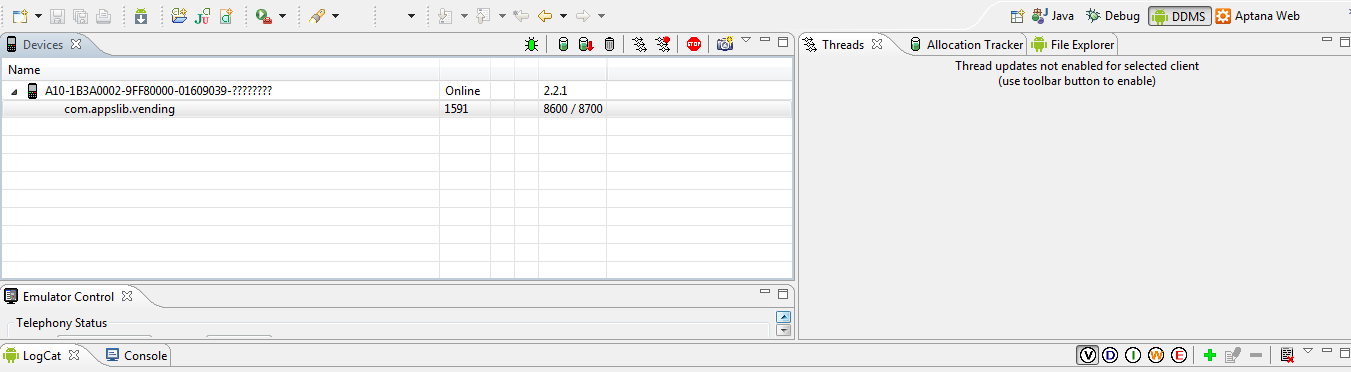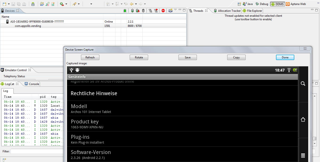 Es ist auch möglich ein Screenshot des angeschlossenes Android-Geräts anzuzeigen, ABER es ist nicht möglich das Tablet als Debug-Device in Eclipse auszuwählen.