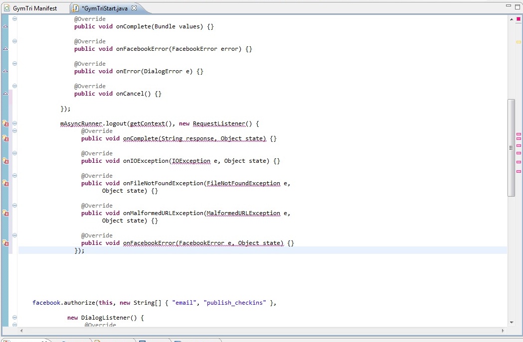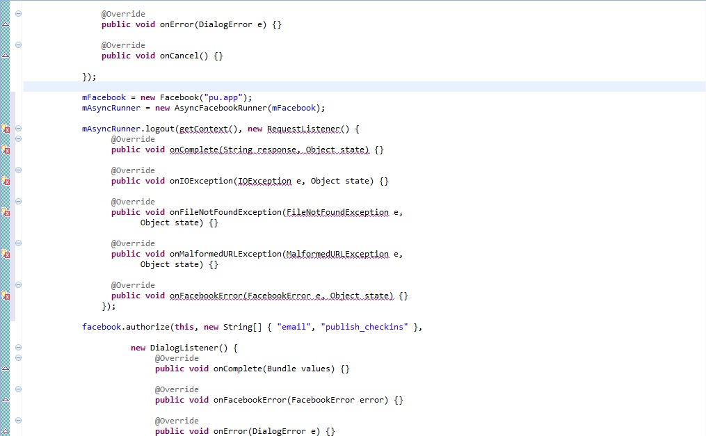 2.) Bei Schritt 7 bekomme ich in der Zeile mAsyncRunner.logout(getContext(), new RequestListener() { ebenfalls den Fehler "Return type for the method is missing".