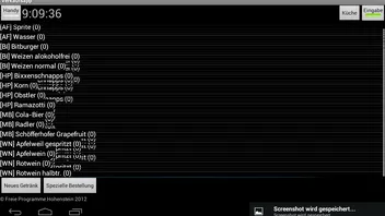 Alles anzeigenpackage com.mbfan.verkaufsapp; import java.util.ArrayList; import java.util.Map; import android.app.Activity; import android.app.AlertDialog; import android.os.Bundle; import android.view.View; import android.view.View.OnClickListener; import android.widget.ArrayAdapter; import android.widget.Button; import android.widget.ListView; import android.widget.RadioButton; import android.widget.Toast; import android.content.DialogInterface; public class VerkaufsappActivity extends Activity implements OnClickListener{ /** Called when the activity is first created. */ ListView lv_objekte; RadioButton rb_eingabe, rb_auslieferung; Button cmd_kueche, cmd_hinzufuegen, cmd_speziell; ArrayList<Map<String, String>> Getraenke; String[] from = { "name", "purpose" }; int[] to = { android.R.id.text1, android.R.id.text2 }; private void initializeVars() { // TODO Auto-generated method stub lv_objekte = (ListView) findViewById(R.id.lv_Objekte); rb_eingabe = (RadioButton) findViewById(R.id.rb_eingabe); rb_auslieferung = (RadioButton) findViewById(R.id.rb_lieferung); cmd_kueche = (Button) findViewById(R.id.cmd_kueche); cmd_hinzufuegen = (Button) findViewById(R.id.cmd_hinzufuegen); cmd_speziell = (Button) findViewById(R.id.cmd_speziell); } private void loaditems() { // TODO Auto-generated method stub String[] values = new String[] { "Fanta", "Cola", "Wasser", "Mezzo-Mix", "Sprite", "Bixxebacher", "Schnaps", "Wein" }; ArrayAdapter<String> inhalte_haupt = new ArrayAdapter<String>(this, android.R.layout.simple_list_item_2, android.R.id.text1, values); lv_objekte.setAdapter(inhalte_haupt); ArrayAdapter<String> inhalte_down = new ArrayAdapter<String>(this, android.R.layout.simple_list_item_2, android.R.id.text2, values); lv_objekte.setAdapter(inhalte_down); } private void setlistener() { cmd_kueche.setOnClickListener(this); cmd_hinzufuegen.setOnClickListener(this); cmd_speziell.setOnClickListener(this); lv_objekte.setOnClickListener(this); } @Override public void onCreate(Bundle savedInstanceState) { super.onCreate(savedInstanceState); setContentView(R.layout.main); initializeVars(); setlistener(); loaditems(); Toast.makeText(this,"Startvorgang komplett. Willkommen zur Verkaufsapp!",Toast.LENGTH_SHORT).show(); } public void onClick(View v) { // TODO Auto-generated method stub switch(v.getId()){ case R.id.lv_Objekte: @SuppressWarnings("unused") Object selected = lv_objekte.getSelectedItem(); case R.id.cmd_kueche: msgbox("Keine Bestellungen aufgegeben!"); } } public void msgbox(String text) { AlertDialog ad = new AlertDialog.Builder(this).create(); ad.setCancelable(false); // This blocks the 'BACK' button ad.setMessage(text); ad.setButton("OK", new DialogInterface.OnClickListener() { public void onClick(DialogInterface dialog, int which) { dialog.dismiss(); } }); ad.show(); } }