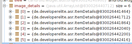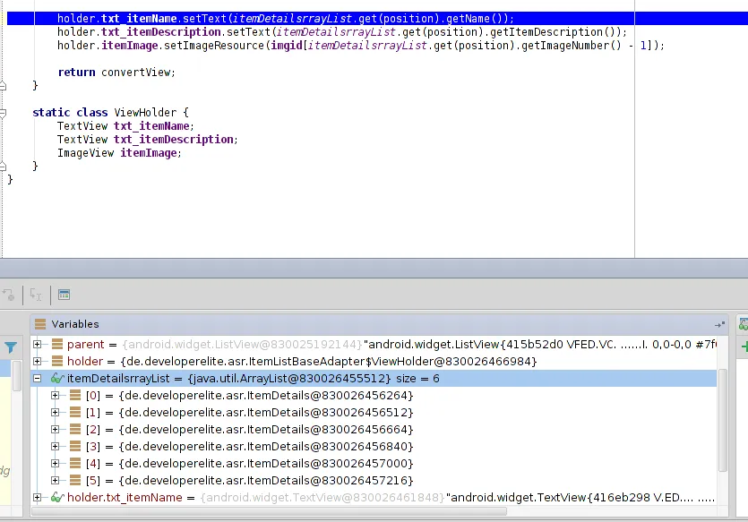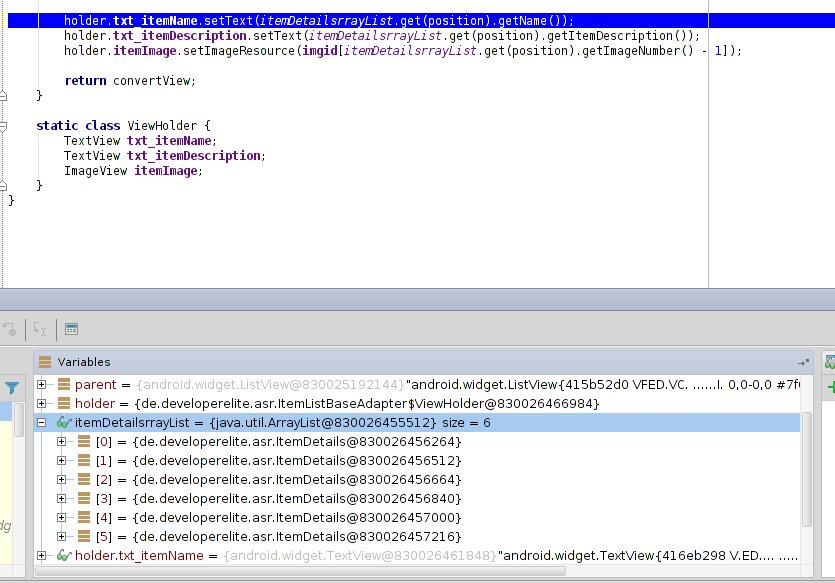 Alles anzeigenpublic class ItemDetails { public String getName() { return name; } public void setName(String name) { this.name = name; } public String getItemDescription() { return itemDescription; } public void setItemDescription(String itemDescription) { this.itemDescription = itemDescription; } public int getImageNumber() { return imageNumber; } public void setImageNumber(int imageNumber) { this.imageNumber = imageNumber; } private String name ; private String itemDescription; private int imageNumber; }ItemListAdapter.java