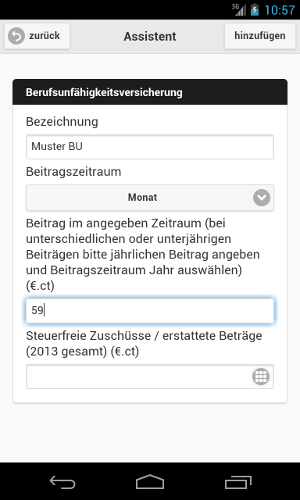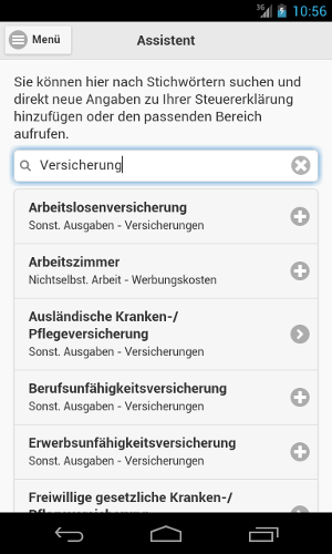Zur Dateneingabe steht ein Assistent bereit. In diesem kann nach Stichwörtern, wie z.B. "Lohnsteuerbescheinigung" oder "Versicherung" gesucht werden. Nachdem die Daten über passende Formulare eingegeben wurden, werden Sie an der richtigen Stelle der Steuererklärung einsortiert. Jeder Bereich kann "appgehakt" werden, um den Überblick über die Steuererklärung zu behalten.