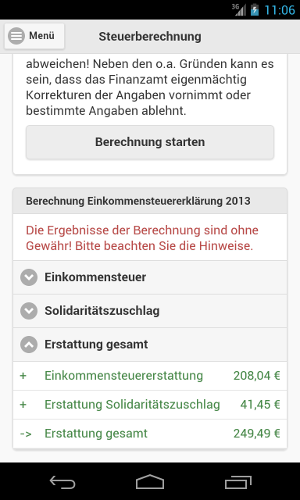 Sind alle Daten eingegeben, kann eine unverbindliche Berechnung der zur erwartenden Steuererstattung/-nachzahlung durchgeführt werden.Die Berechnung bietet einen Überblick über die wichtigsten Zahlen.
