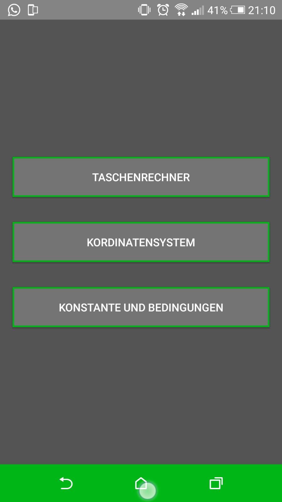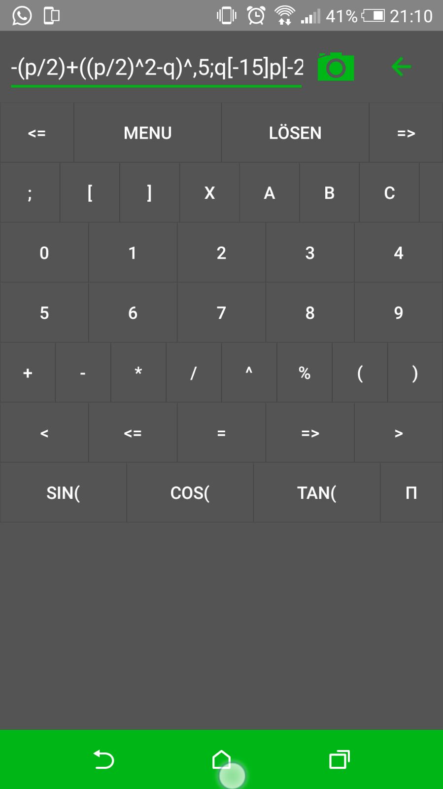 Was mir persönlich am wichtigsten war, das ich Konstanten und Terme einspeichern kann und schell wieder Verwenden kann. Zum Beispiel die p-q-Formel ("x1,2=-(p/2) +- ((p/2)2-q)^0.5")Es würde mich Freuen, wenn ihr meine App bewertet hinsichtlich der Farbgebung, wie zum Beispiel: Zu grelles Grün oder sowas, Der Oberfläche zb.: Hab nicht verstanden wie ich was Öffne oder wie ich was Speichere