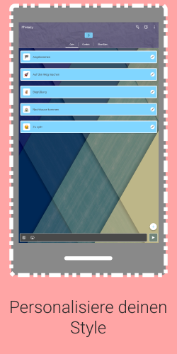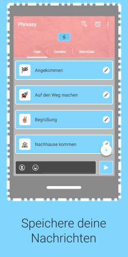 Ein kleines Beispiel zur Nutzung: eine Kategorie "Auf dem Weg" beinhaltet dann die Phrasen "Mache mich jetzt auf den Weg" und "Komme jetzt vorbei" und Phreasy wählt eine zufällige (und passende für bspw. ihre Empfänger-Gruppe wie Business oder Familie) bei einem Klick auf die Kategorie aus und Ihr könnt diese weiter bearbeiten, weitere anhängen oder direkt verschicken.