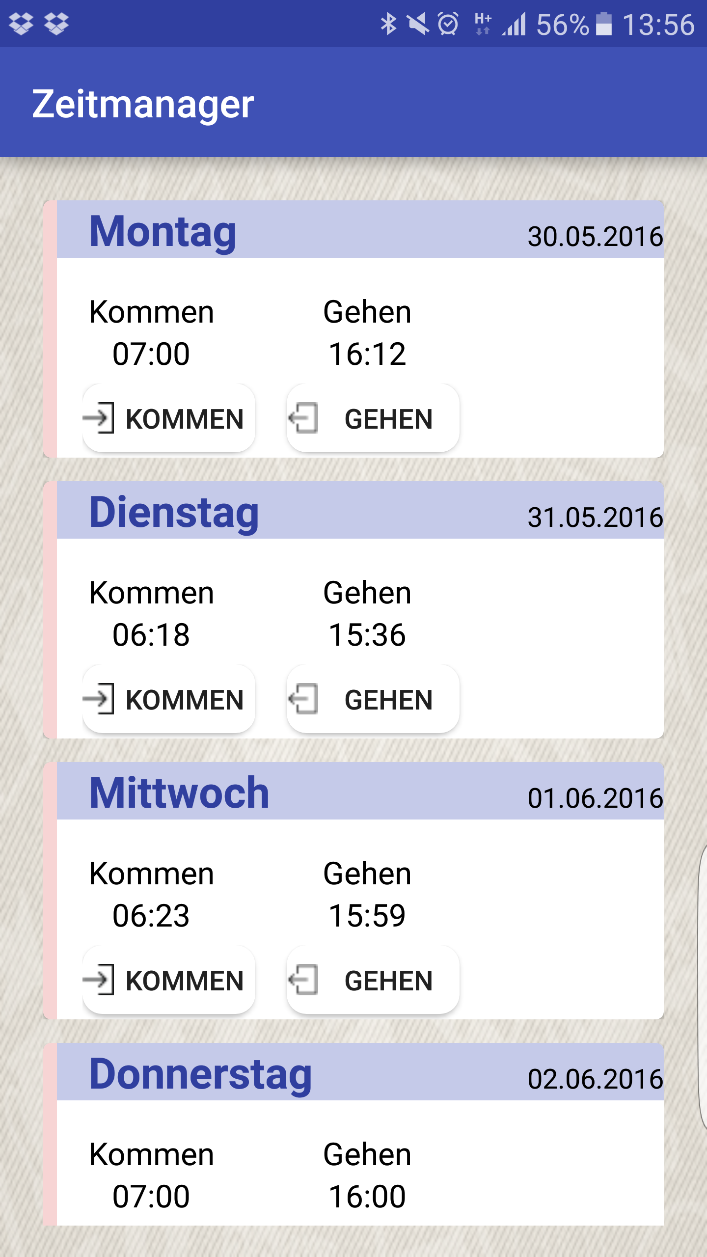 Auf Main2 sieht man bei Donnerstag, da heute Donnerstag ist, die Möglichkeit einfach auf den Kommen Button unter "Kommen" zu drücken. Nach dem Klick ist man sozusagen eingecheckt das gleiche mit gehen