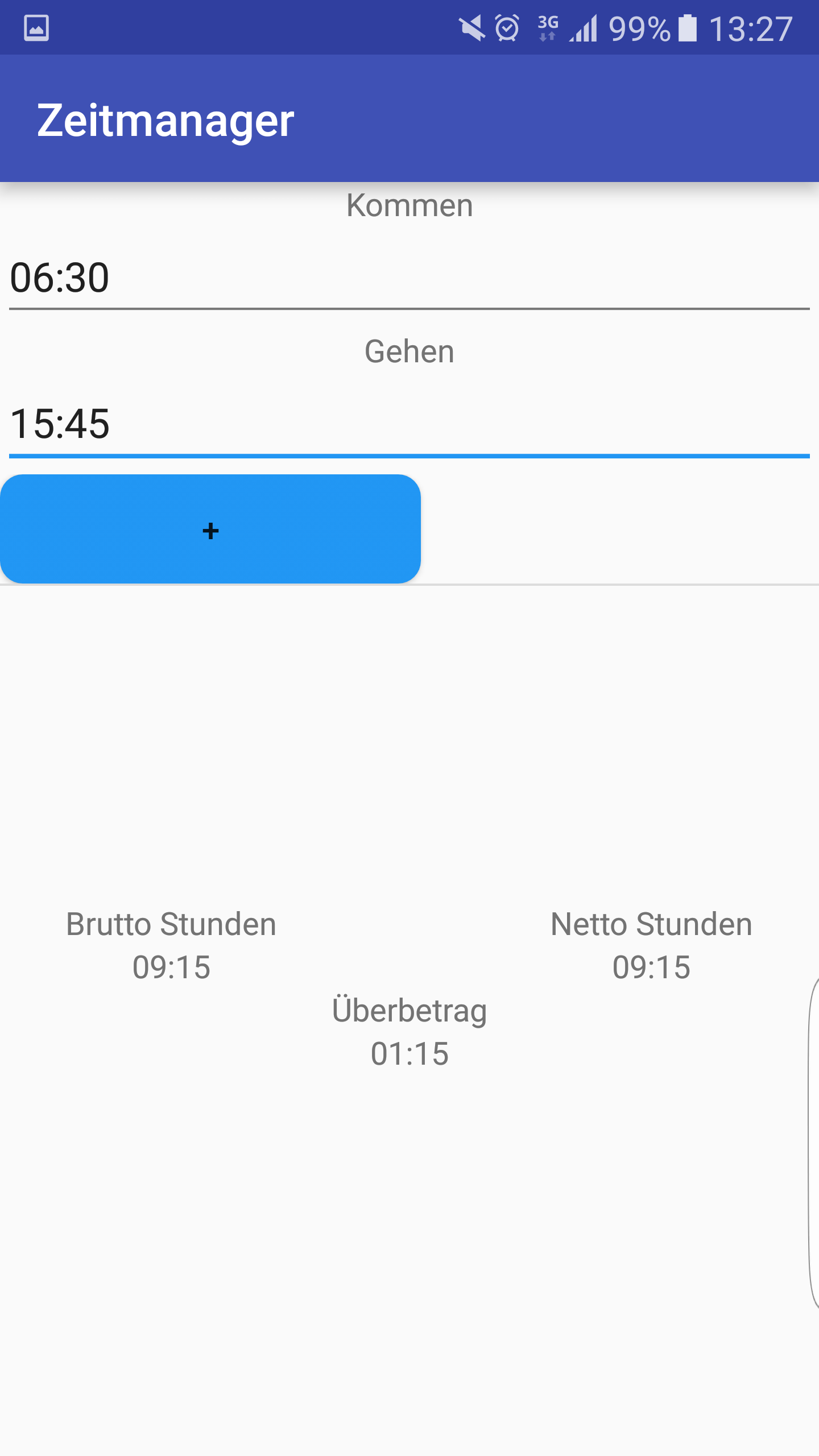 Unter der ListView sieht man 3 TextViews mit Netto, Brutto und Pausenstunden, bei denen bin ich noch am Überlegen wie ich die anders darstelle.