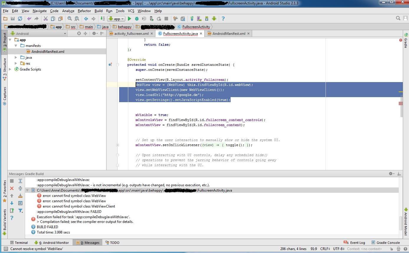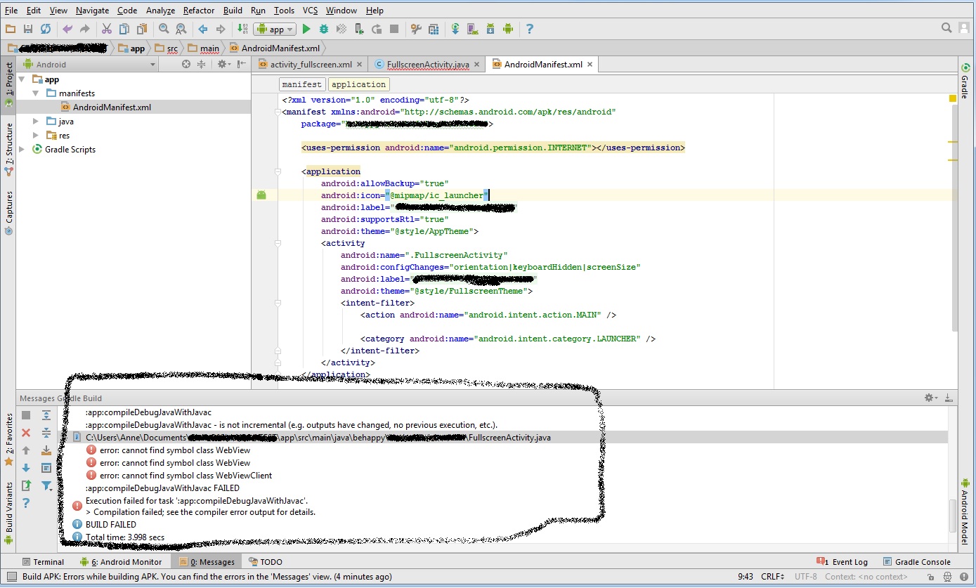 Android Manifest : (Unten eingerahmt könnt ihr auch nochmal den Fehler nachlesen den er mir gibt )