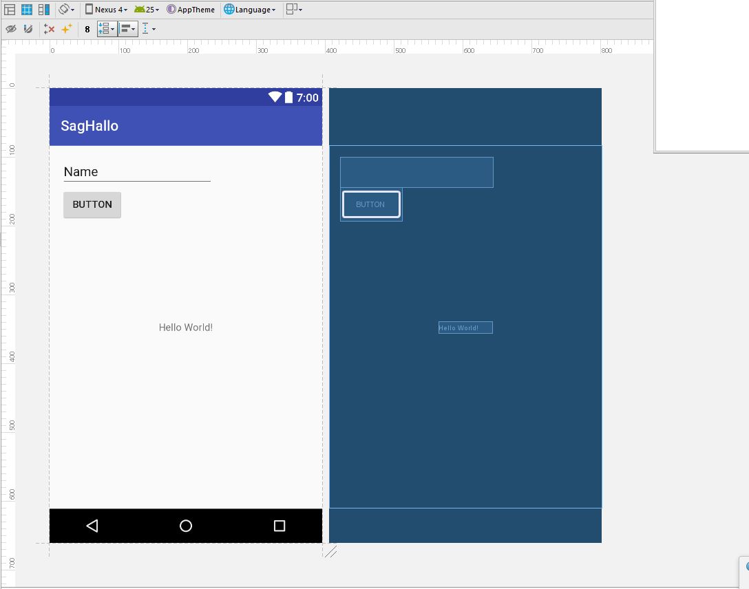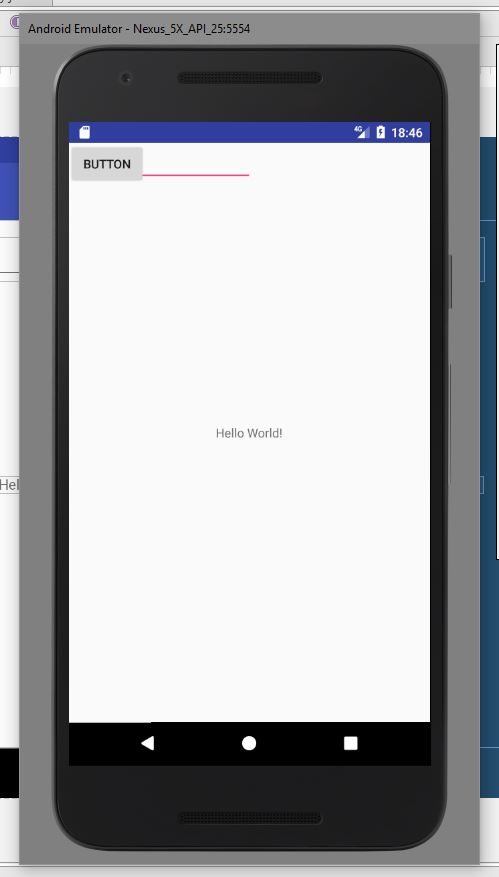 Alles anzeigen<?xml version="1.0" encoding="utf-8"?> <android.support.constraint.ConstraintLayout xmlns:android="http://schemas.android.com/apk/res/android" xmlns:app="http://schemas.android.com/apk/res-auto" xmlns:tools="http://schemas.android.com/tools" android:layout_width="match_parent" android:layout_height="match_parent" tools:context="de.androidnewcomer.saghallo.MainActivity"> <TextView android:layout_width="wrap_content" android:layout_height="wrap_content" android:text="Hello World!" app:layout_constraintBottom_toBottomOf="parent" app:layout_constraintLeft_toLeftOf="parent" app:layout_constraintRight_toRightOf="parent" app:layout_constraintTop_toTopOf="parent" /> <Button android:id="@+id/button" android:layout_width="wrap_content" android:layout_height="wrap_content" android:text="Button" tools:layout_editor_absoluteX="16dp" tools:layout_editor_absoluteY="59dp" /> <EditText android:id="@+id/editText" android:layout_width="wrap_content" android:layout_height="wrap_content" android:ems="10" android:inputType="textPersonName" android:text="Name" tools:layout_editor_absoluteX="16dp" tools:layout_editor_absoluteY="16dp" /> </android.support.constraint.ConstraintLayout>Grüße Swoopo.