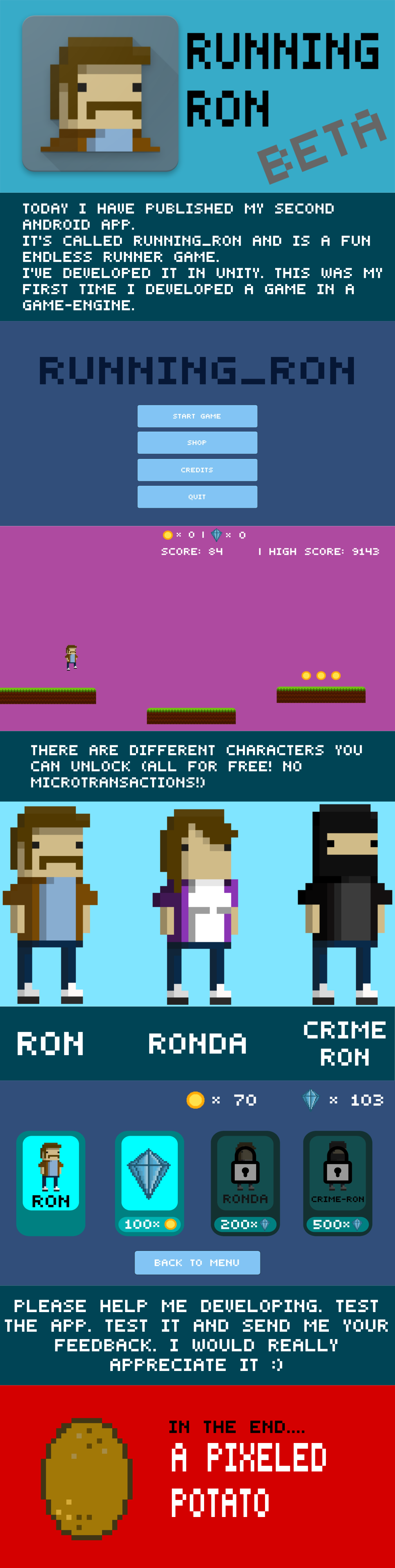 Das Spiel dreht sich um Ron. Um Ron springen zu lassen, muss der User auf den Bildschirm tippen. Der Player muss von Plattform zu Plattform springen. Wenn eine Gewisse Distanz zurückgelegt wurde kommen neben Plattformen auch noch Trampoline und Hindernisse hinzu.