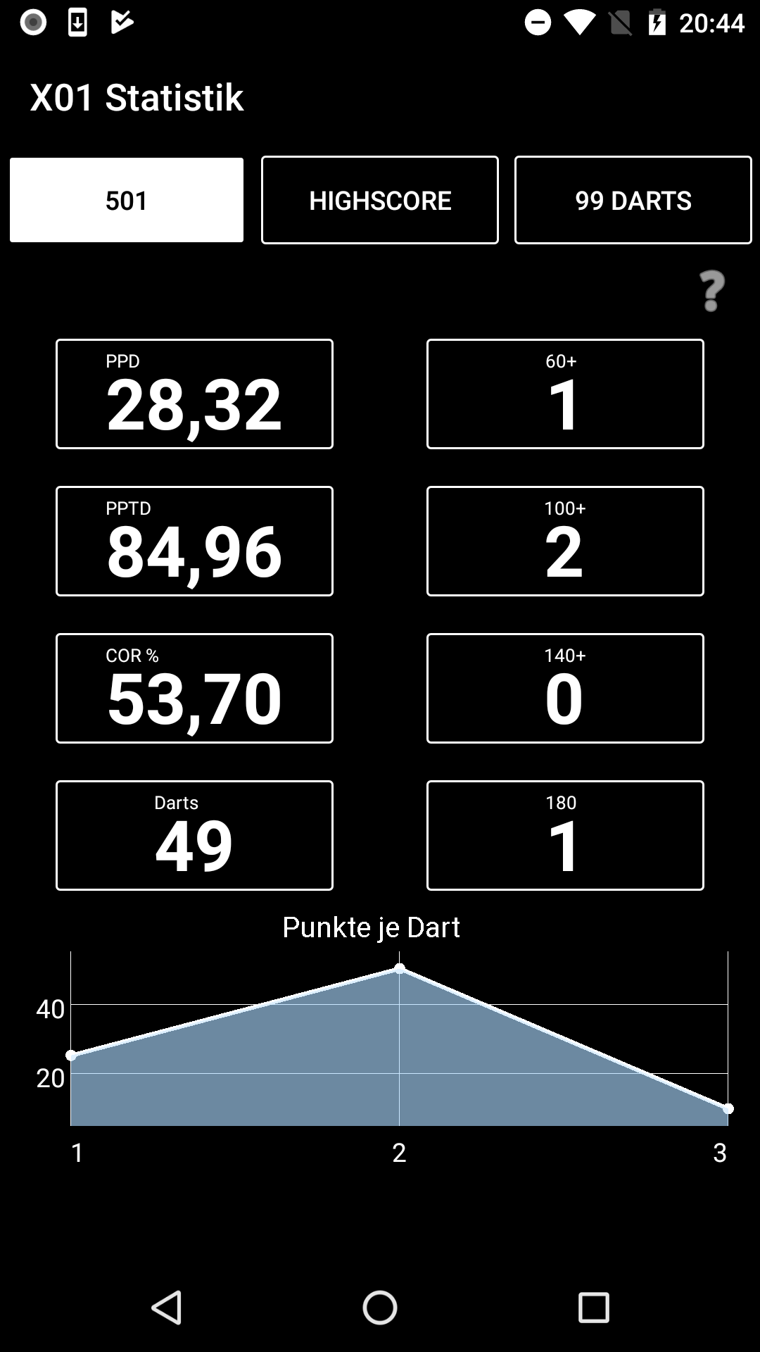 Die Statistik für die bereits implementierten Übungen (X01, Highscore und 99 Darts auf X), zeigt dem Nutzer diverse Werte, wie zum Bespiel Punkte pro Dart, Anzahl der insgesamt geworfenen Dart und noch einiges mehr. Weiters ist ein kleiner Graph implementiert der dem User grafisch seine Punkte pro Dart pro Übung anzeigt.