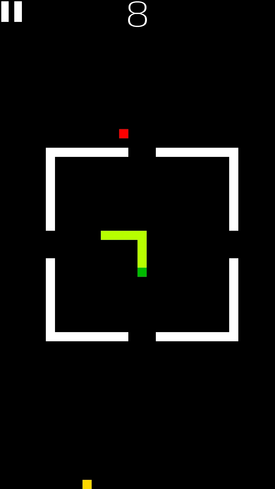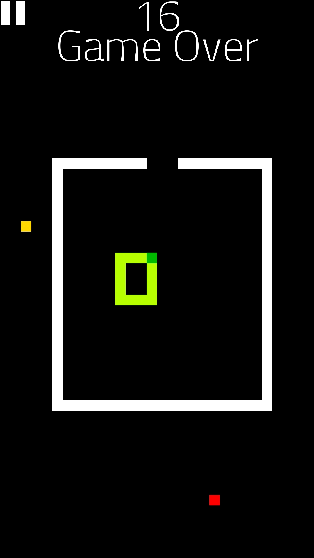 Das Spielprinzip ist wie beim "richtigen" Snake recht einfach. Ihr müsst die Schlange durch Wischen über den Bildschirm steuern und die gelben Rechtecke einsammeln, um länger zu werden (durch die roten werdet ihr kürzer, also die lieber nicht fressen).