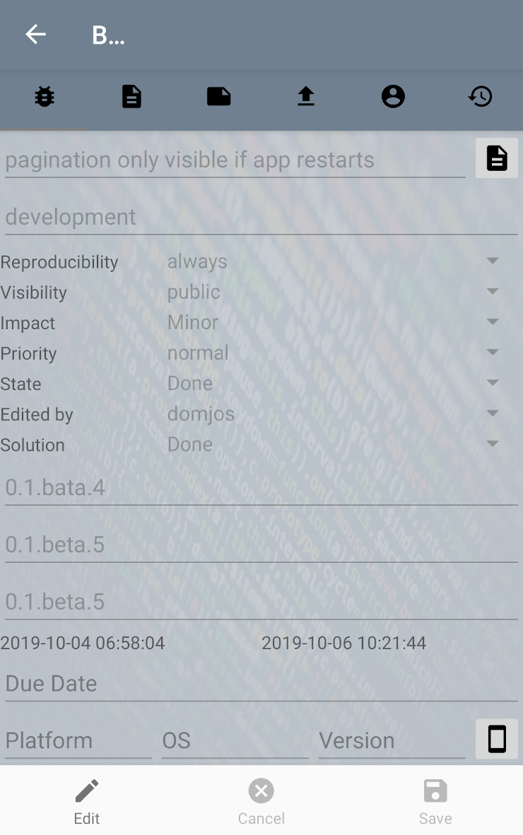 Außerdem enthält die App auch eine eigene simple Implementierung eines Bug-Trackers. So kann man auch Bugs in der App notieren, ohne diese einem Bug-Tracker zuzuordnen.