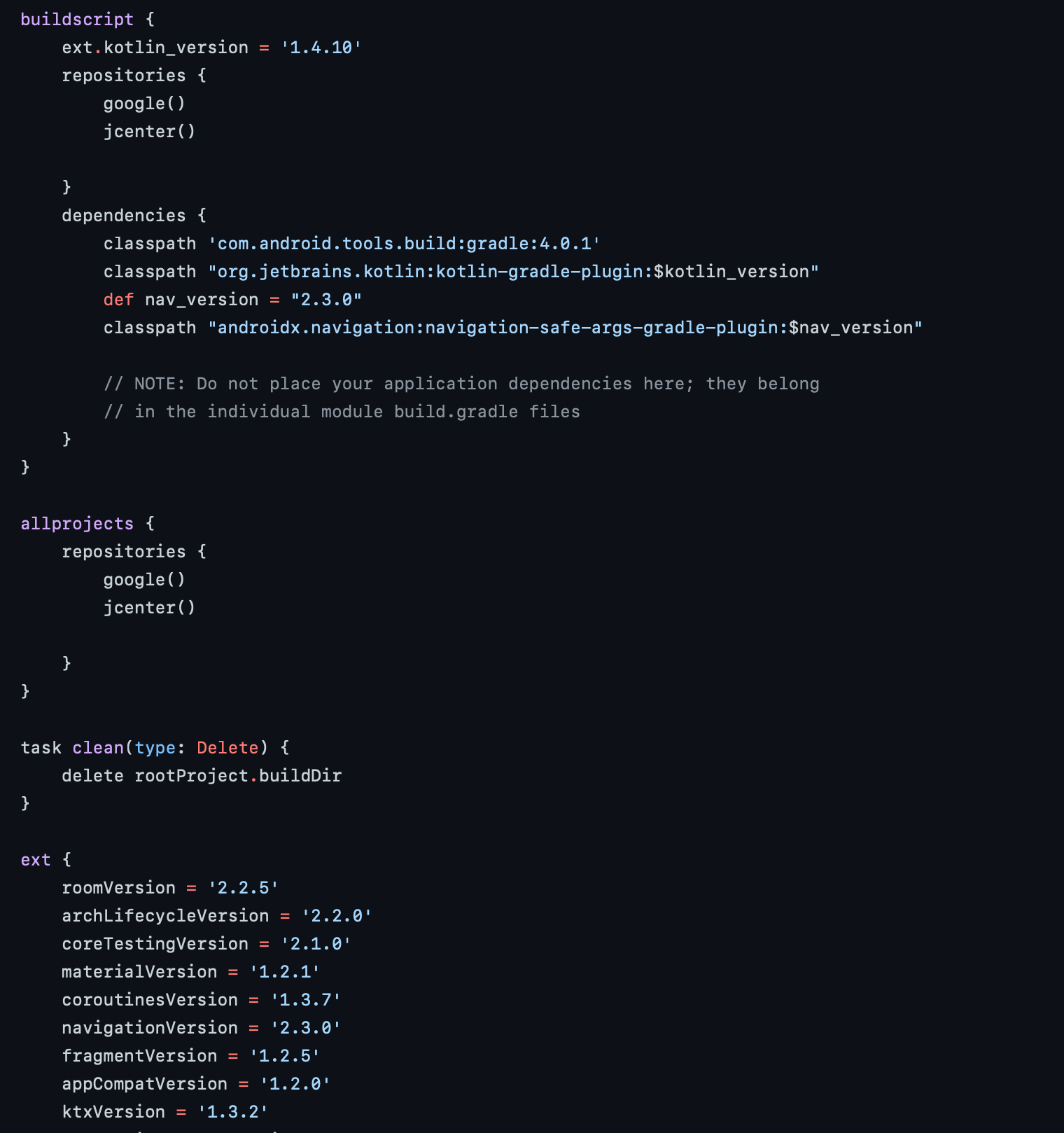 Ich möchte das SafeArgs Plugin installieren und dazu muss ich in build.gradle (Project) und build.gradle (Module) irgendwas rein schreiben. In allen Tutorials ist aber die Datei immer anders aufgebaut (s. build.gradle eigentlicher Zustand) als bei mir (s. build.gradle mein Zustand) und deswegen weis ich nicht wo ich die befehle hinzufügen soll. Weis jemand warum das so anders aussieht und was ich dagegen tun kann oder wie ich safeArgs installieren kann?